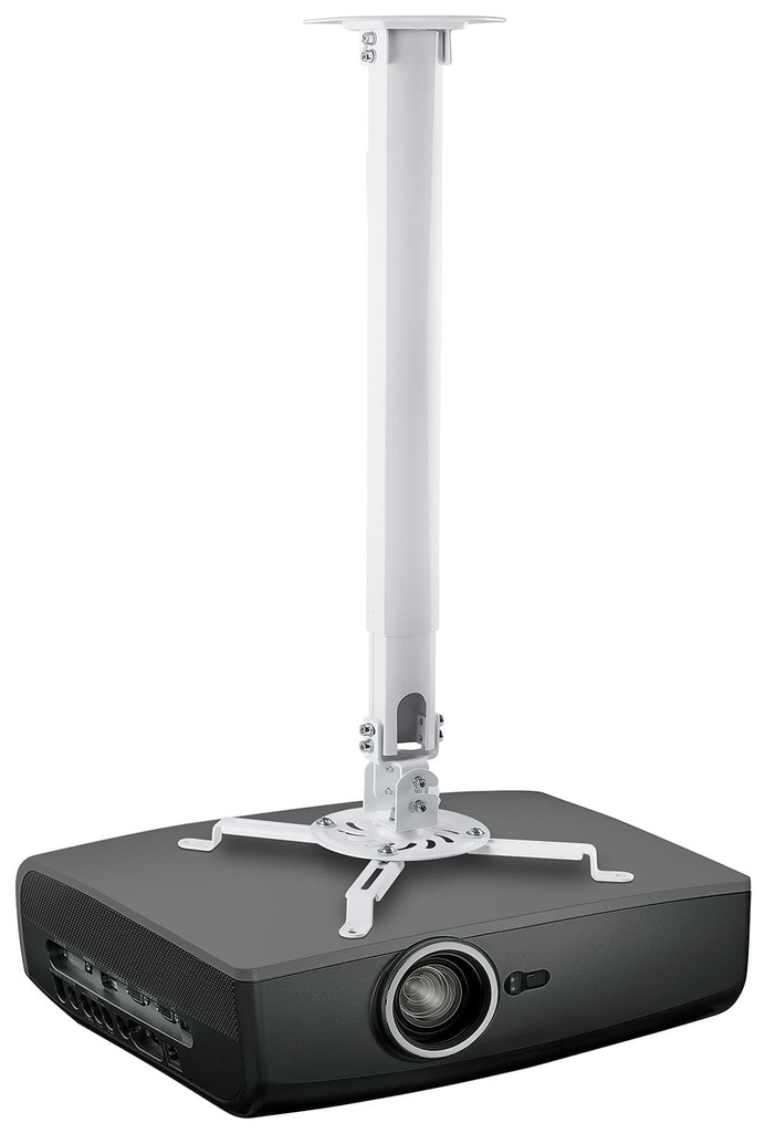 Soporte de techo universal para proyector en color blanco con un ajuste de altura de 21" a 34.5", permite una rotación de 360° y también se inclina y gira para que puedas encontrar el ángulo perfecto para la proyección